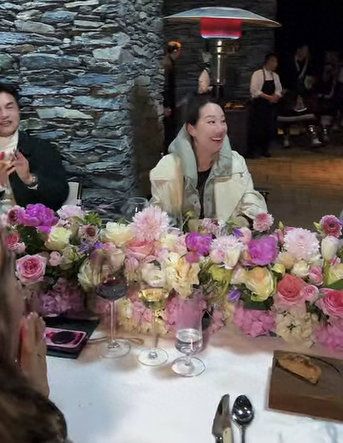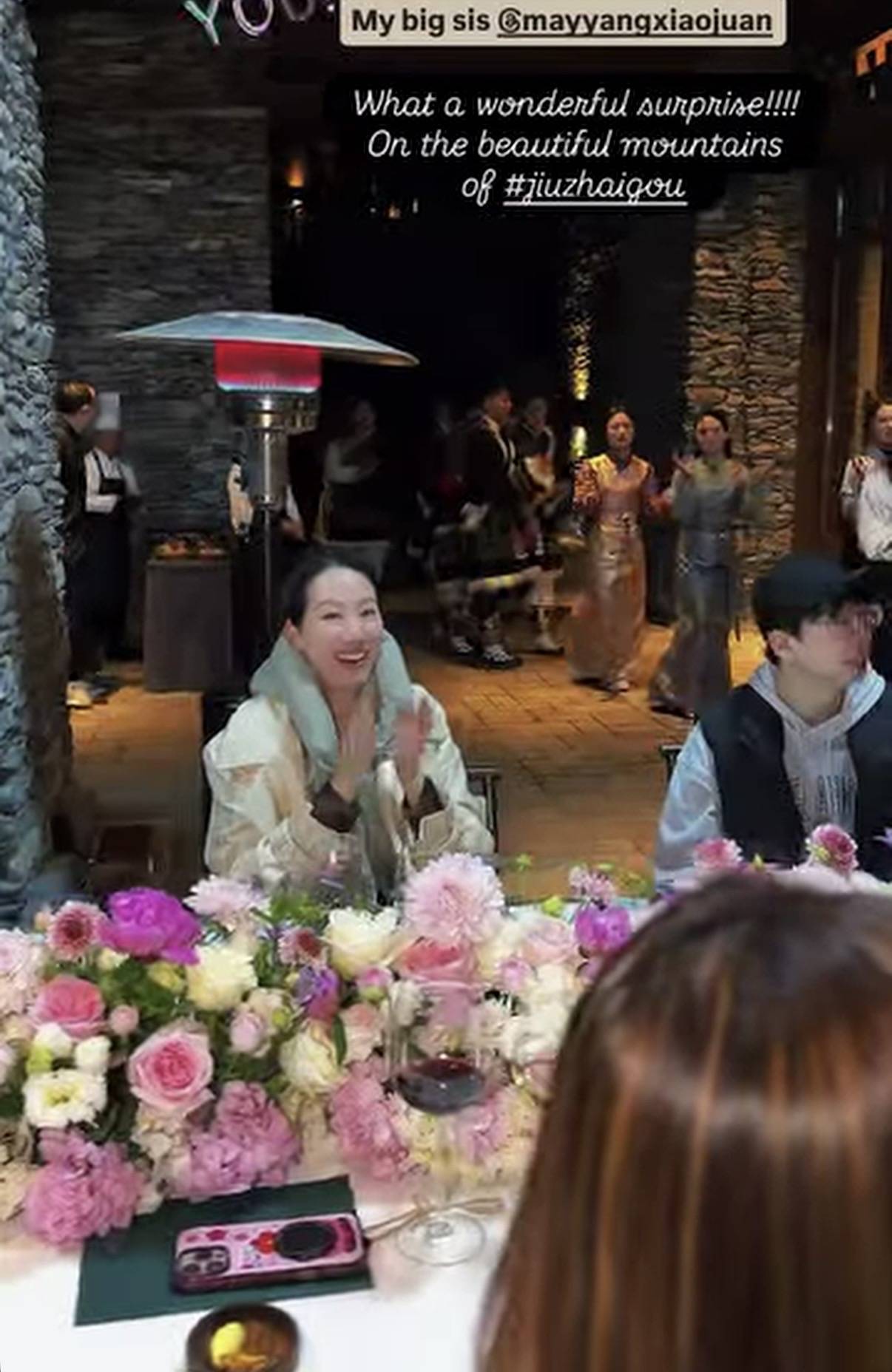 九寨沟的古城墙下,长桌宴已经摆得满满当当。古墙石墩配上满桌鲜花,氛围感直接拉满!吕良伟夫妇带着儿子,汪诗诗也牵着自家娃,十多个人围坐在一起,本来还以为就是普通的朋友聚餐。结果突然从城墙外走进来一群穿民族服装的人,领头的阿姨一边唱歌一边鼓掌,身后还推着三层高的车厘子蛋糕——这时候汪诗诗才反应过来,原来大家是在给她庆生!
