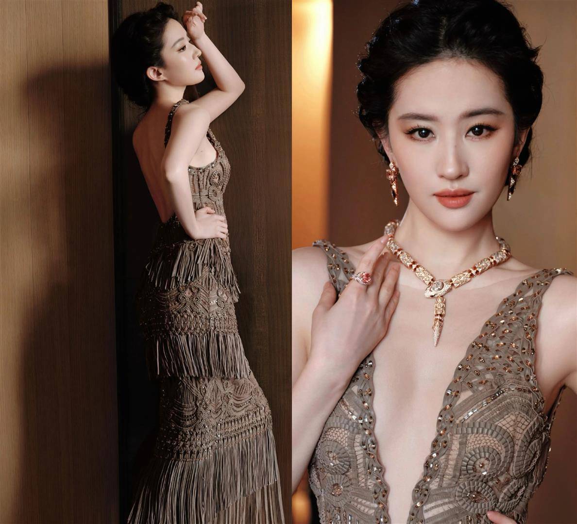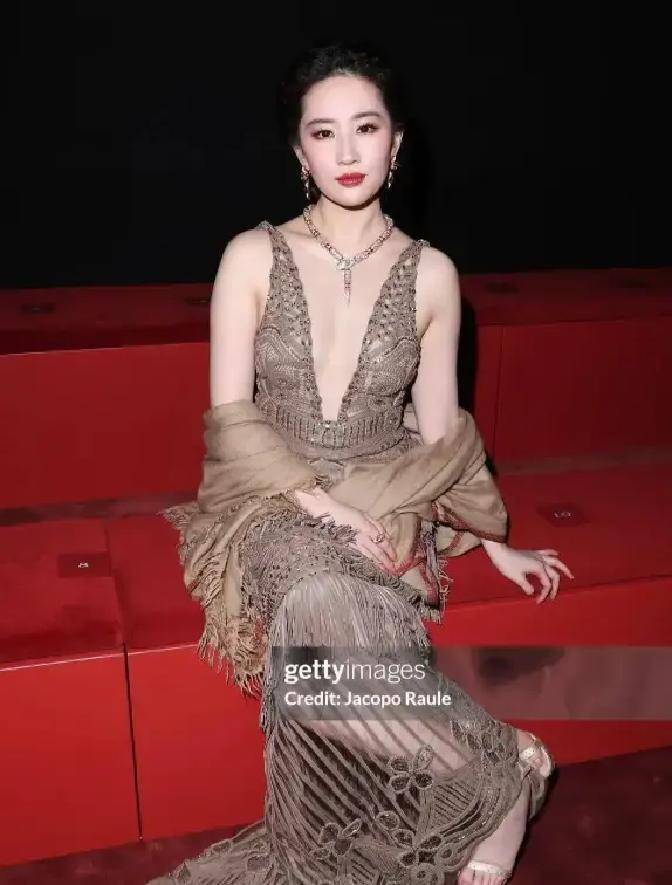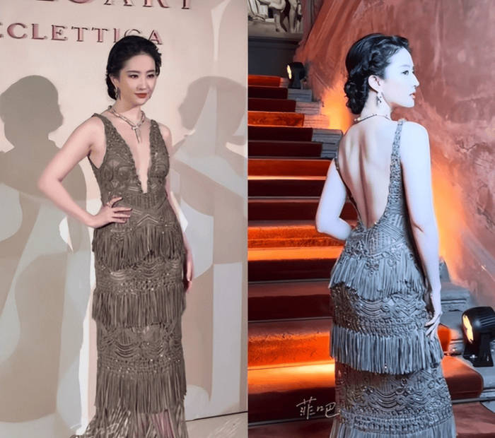 据悉,该礼服来自某顶级高定品牌,手工缝制的水晶流苏垂坠感十足,蓝绿色宝石珠宝与裙装光泽相互映衬。设计细节上,深V剪裁与背部镂空既凸显身材优势又不失端庄,但有网友认为咖色主调显老气,流苏装饰过于繁琐,未能凸显刘亦菲的清冷气质。