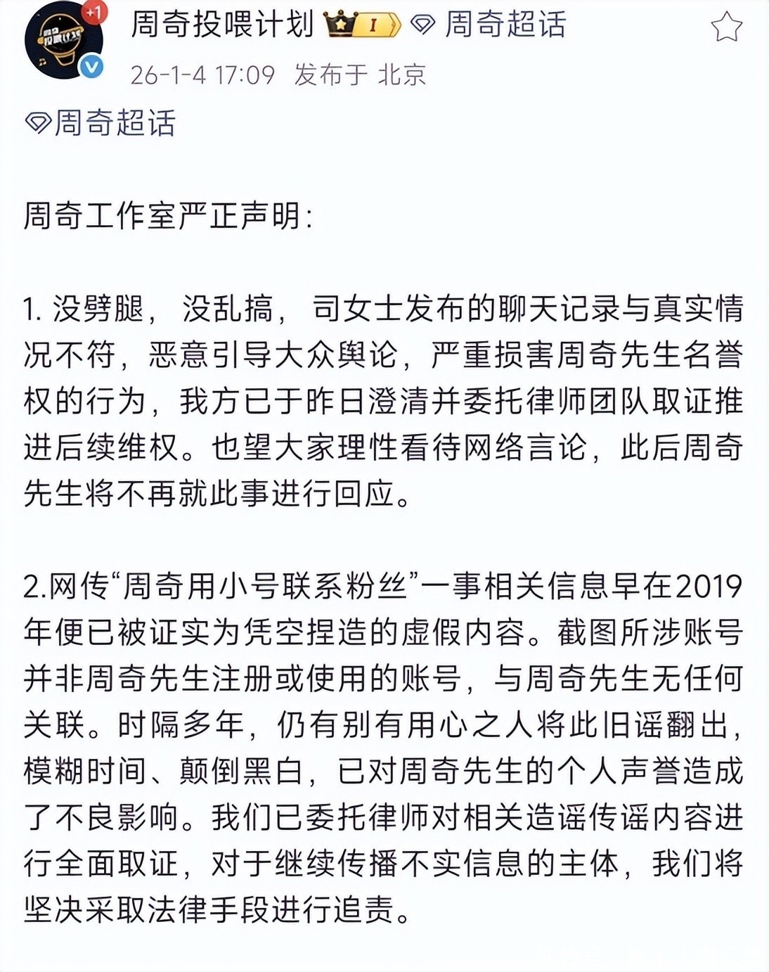 演员周奇工作室发布声明:没劈腿,没乱搞,网传"用小号联系粉丝"一事已被证实为虚假内容---杭州日报---2026-01-04--杭州日报